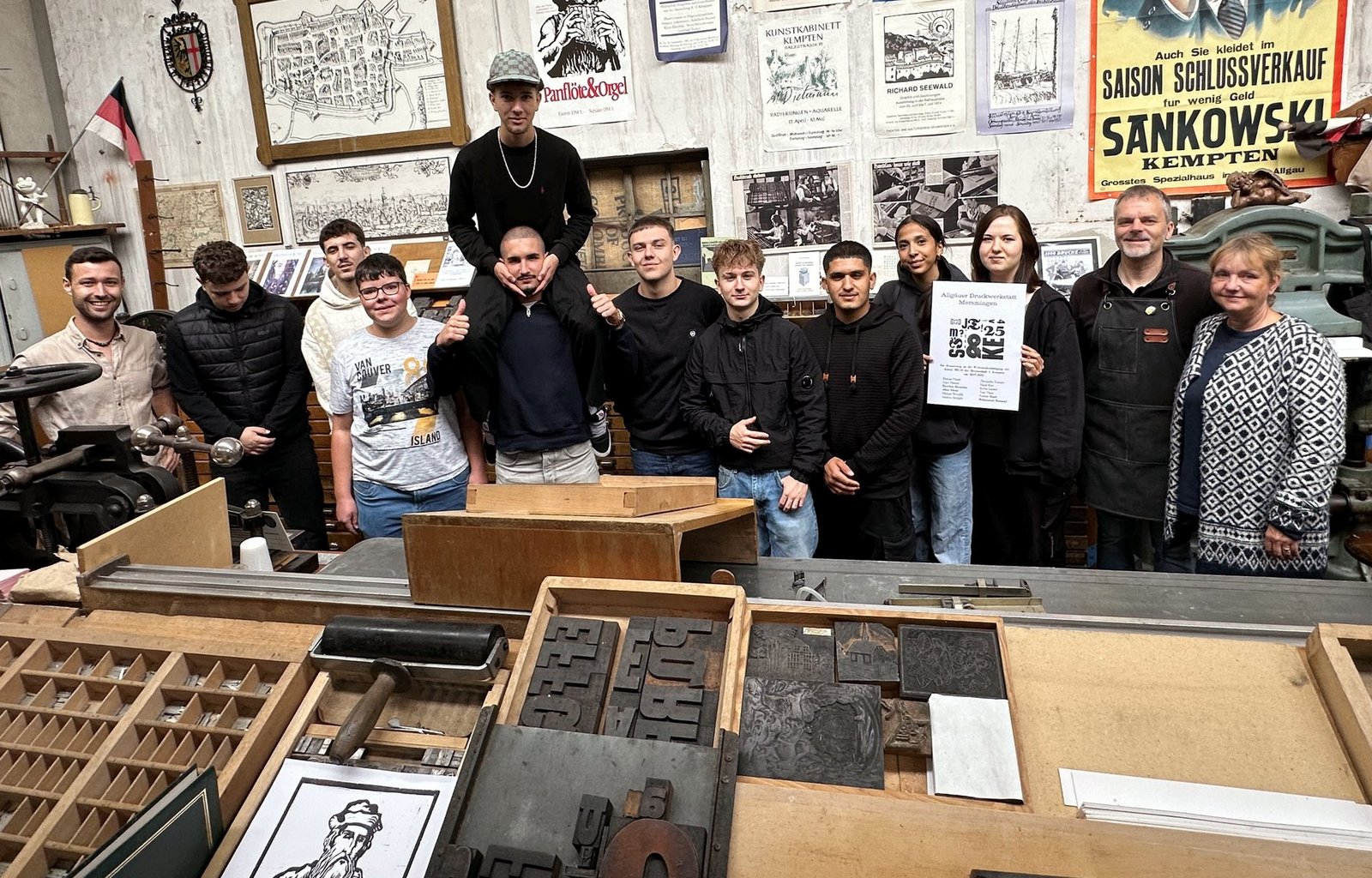 Ein ganz besonderer Schultag führte die Klasse MD10 am 28.07.2025 nach Memmingen in die Allgäuer Druckwerkstatt – ein Ort, an dem Geschichte greifbar wird und Druckkunst noch echtes Handwerk bedeutet. Dort tauchten die angehenden Medientechnologinnen und Medientechnologen in die Ursprünge ihres zukünftigen Berufs ein und durften selbst Hand anlegen.