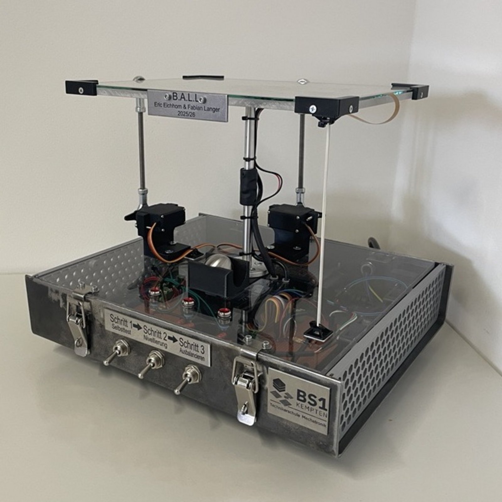 Das Projekt umfasst die Entwicklung eines mechatronischen Systems, das die Position einer Kugel auf einer beweglichen Platte stabil im Mittelpunkt hält.