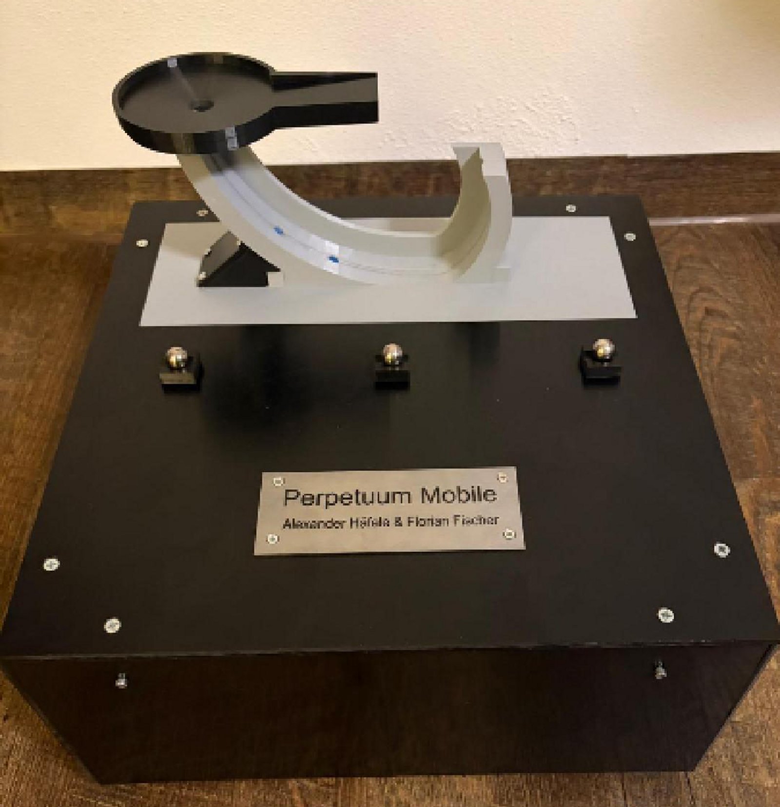 Dabei handelt es sich um eine Art Kugelbahn in deren Trichter eine Metallkugel eingelegt wird. Diese rollt die Bahn herunter und fliegt am Ende wieder zurück in den Trichter. Dort beginnt der Bewegungsablauf von vorn.