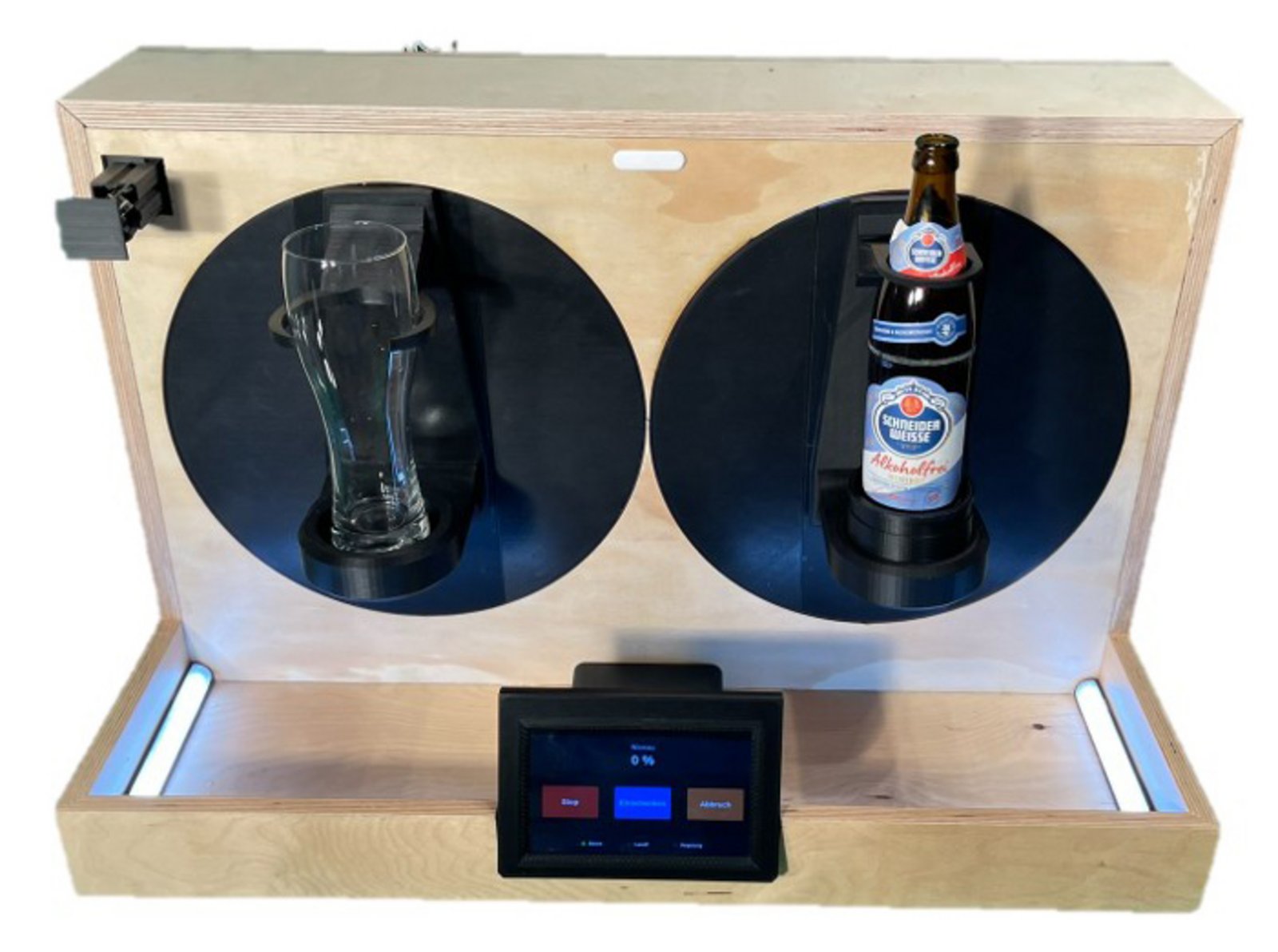 Einfach Glas und Weizenflasche (=Weissbierflasche) einstellen ... Einschenkvorgang starten ... und schon wird das kühle Hopfengetränk fachgerecht und unter Aufsicht der Bildüberwachung und KI-Regelung eingeschenkt. Prost!